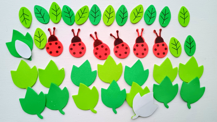 Setul conține frunze și buburuze din spumă gumată autoadezivă imprimată cu negru.