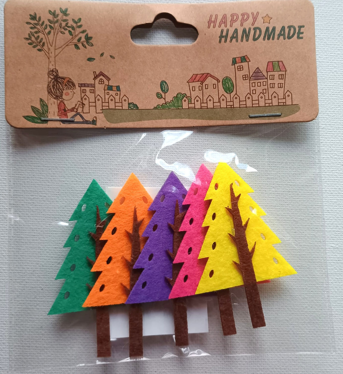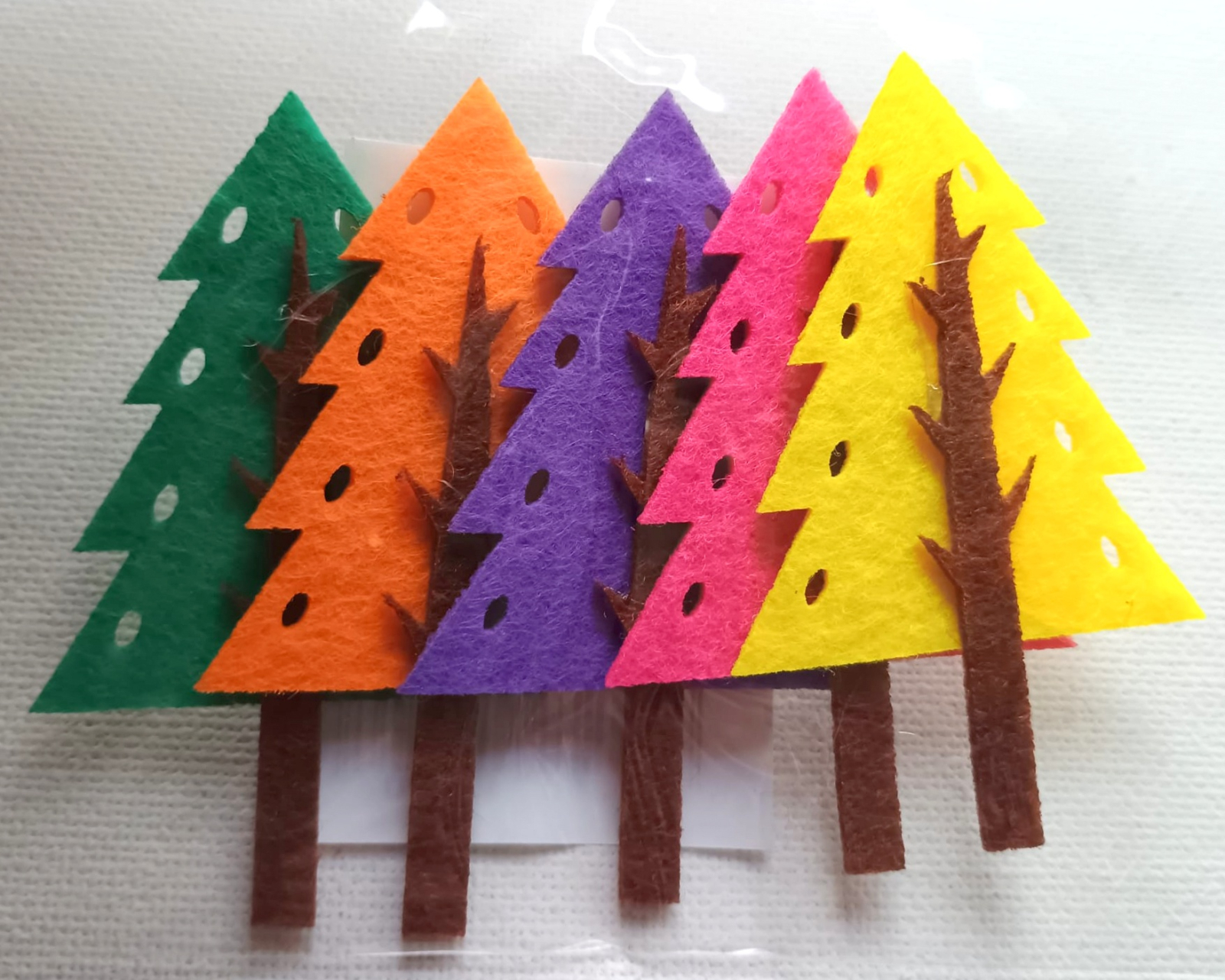 Set 5 brazi decupați din fetru/ pasla color, în 2 straturi, cu grosimea de 2 mm. Tulpina brazilor este din fetru maro, iar brazii din set au culoarea galben, verde, violet, portocaliu și violet.