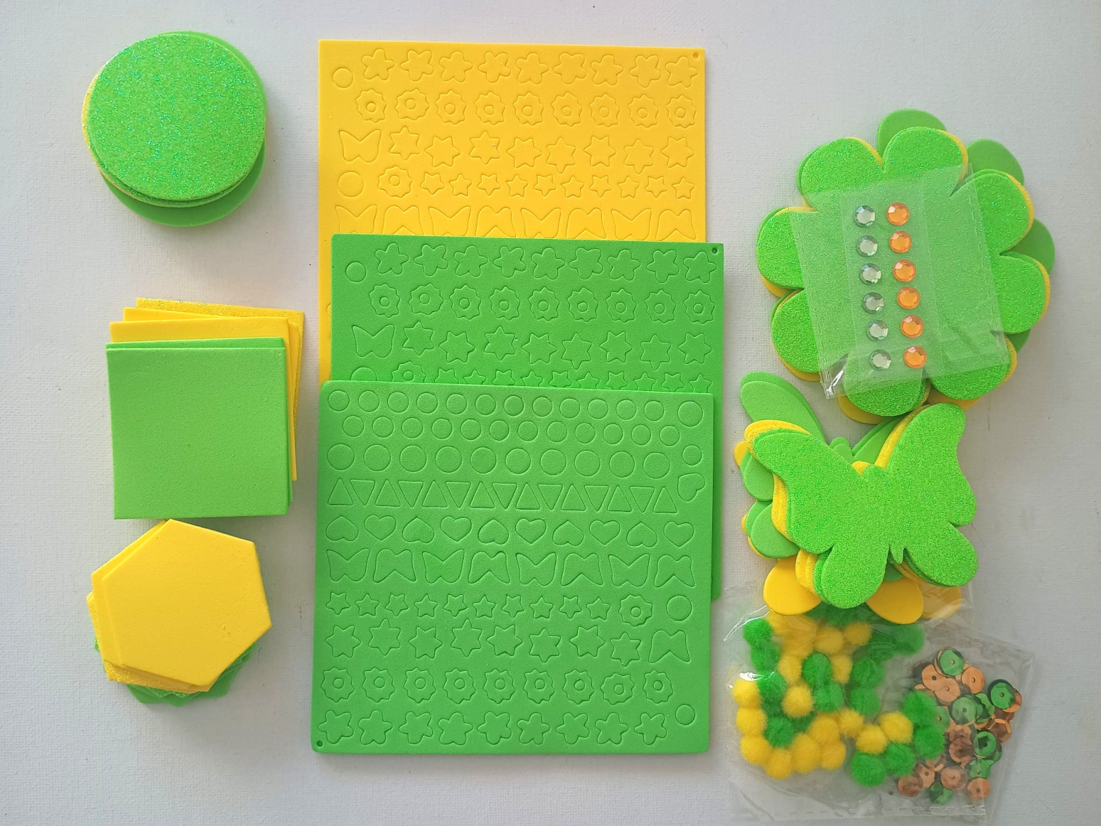 - 8 pătrate 5 cm, spumă gumată verde lămâie și galben, glitter și simplă