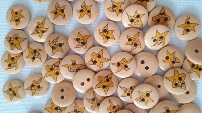 50 nasturi din lemn naturi cu model imprimat stele vesele. Dimensiunea unui nasture este de 1,5 cm.