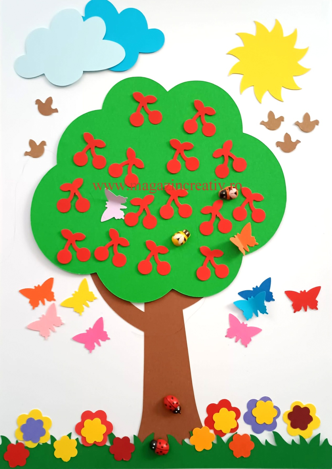 - 1 coală carton alb A4 Mondi, 250 grame, 1 jeton model de lucru, 1 trunchi copac maro deschis 15 cm/ 9,5 cm, 1 coroana copac 16 cm verde inchis, 1 fasie verde închis iarba 20 cm, 1 soare galben 5,5 cm, 2 nori bleu-albastru 6 cm, 15 cirese rosii 2,5 cm, 10 fluturi 2,5 cm, 10 flori 1,6 cm, 5 flori cm, 2 buburuze lemn, 2 albine lemn, 5 păsărele maro deschis 1,5 cm. Toate decupajele sunt decupate din carton color 160 grame.