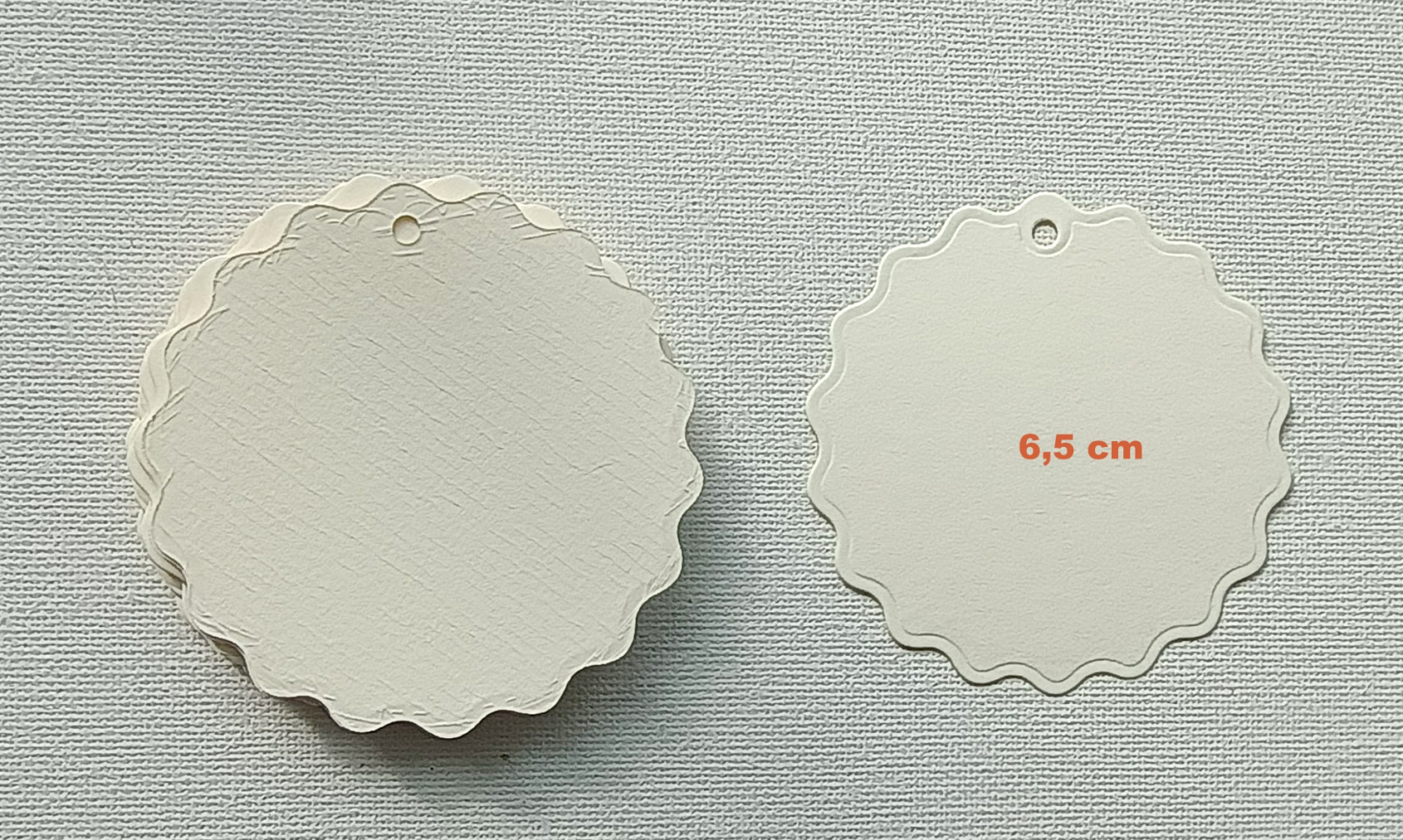 Diametrul etichetelor este 6,5 cm. Toate etichetele au orificiu pentru snur.
