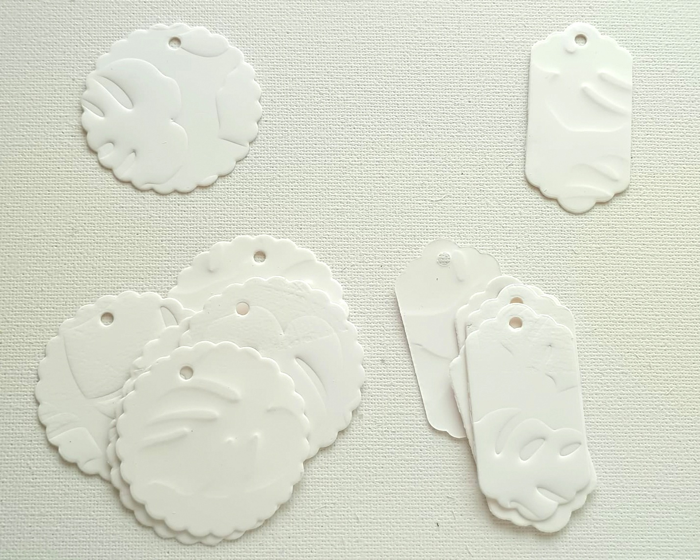 Set 30 etichete, decupate din carton alb unt 240 grame, cu model în relief frunze.