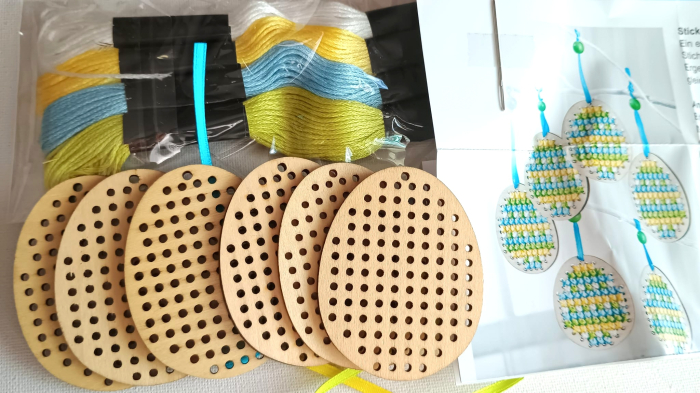 Setul contine 6 oua din lemn cu model perforat cu dimensiunea de 5 cm/ 6,5 cm, 1 ac mare, 4 seturi de ață bumbac și 2 șnururi mătase.
