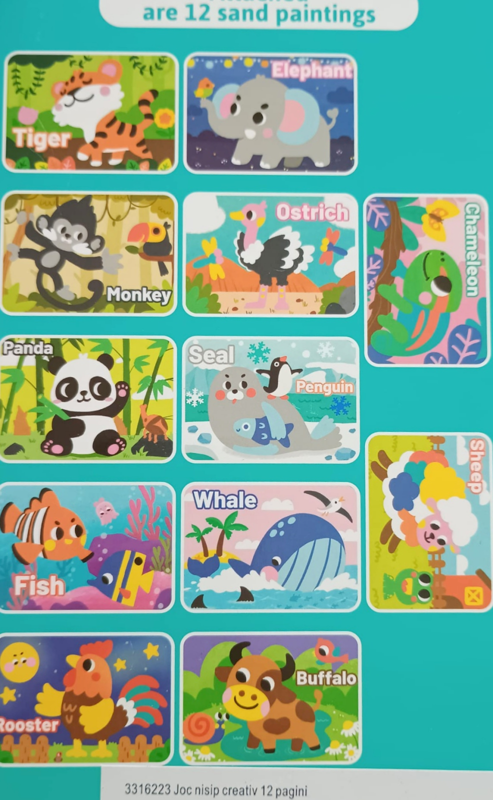- 14 recipiente cu nisip colorat fin, granulație 0.1, prevăzute cu picurător. Culori incluse: roșu, alb, ocru, verde, gri, albastru, negru, roz, maro, portocaliu, bleu, galben și turcoaz.