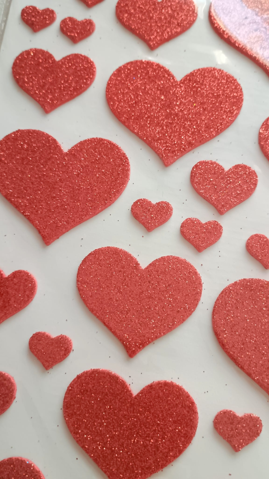 Setul contine aproximativ 39 inimi din spumă gumată autoadezivă glitter.