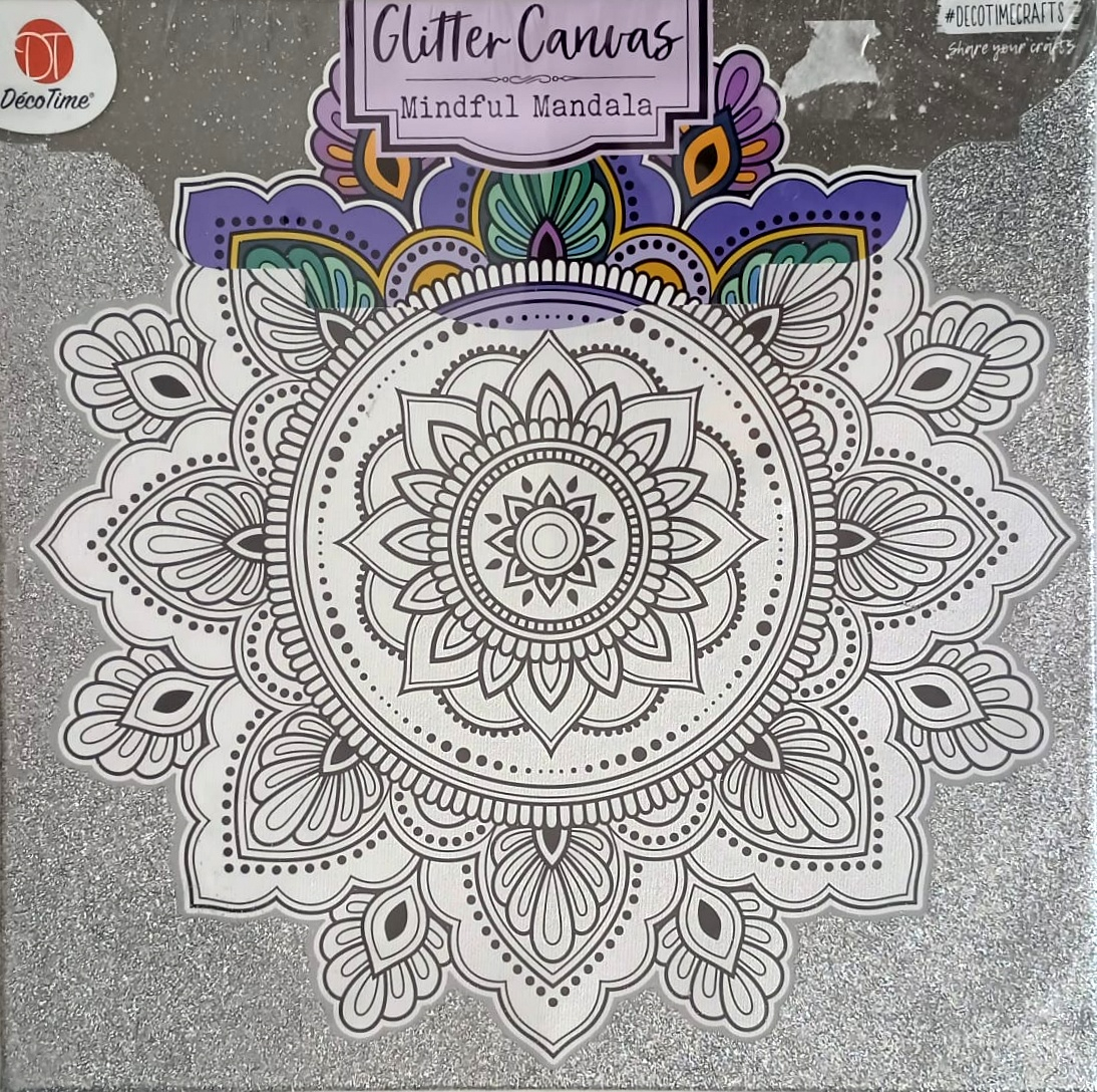 Pânză canvas este imprimată cu model MANDALA și fond glitter argintie.