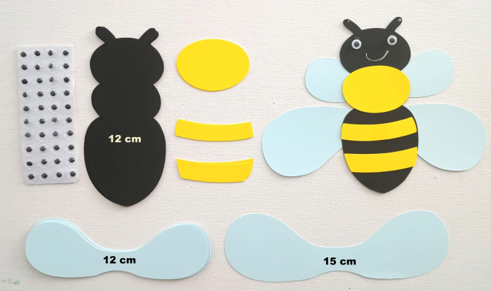 Accesoriile pentru confectionarea albinei sunt: 2 inimi negre cu dimensiunea de 7,5 cm/ 6,5 cm, 1 inima galbena cu dimensiunea de 7,5 cm/ 6,5 cm, 1 inima dubla galbena cu dimensiunea de 7,5 cm/ 6,5 cm (in interiorul inimei se poate scrie mesajul), 2 inimi bleu cu dimensiunea de  6,5 cm/ 5 cm (pentru aripi), 2 inimi galbene cu dimensiunea de 2,5 cm, 2 fasii carton negru 5 cm (pentru antene), 2 ochi mobili (pentru cap).