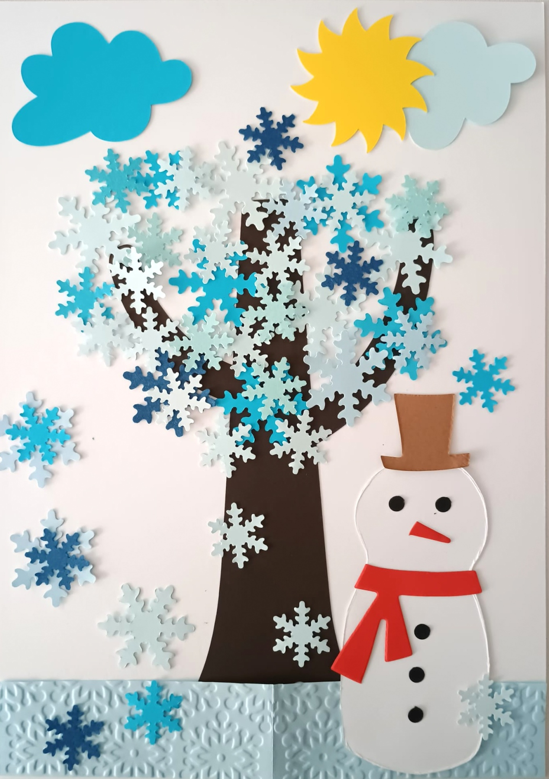 - 1 trunchi copac maro inchis 20 cm, 40 de fulgi bleu, albastru deschis, albastru inchis, cu dimensiunea de 3,7 (10 bucati) cm si 2,5 cm (30 bucati), 1 fasie hartie bleu embosata, cu model in relief decorativ (pentru zapada), 1 om de zapada (corp, palarie, fular, nas, ochi, nasturi), 1 soare galben 5,5 cm, 2 nori albastru și bleu cu dimensiunea de 7 cm