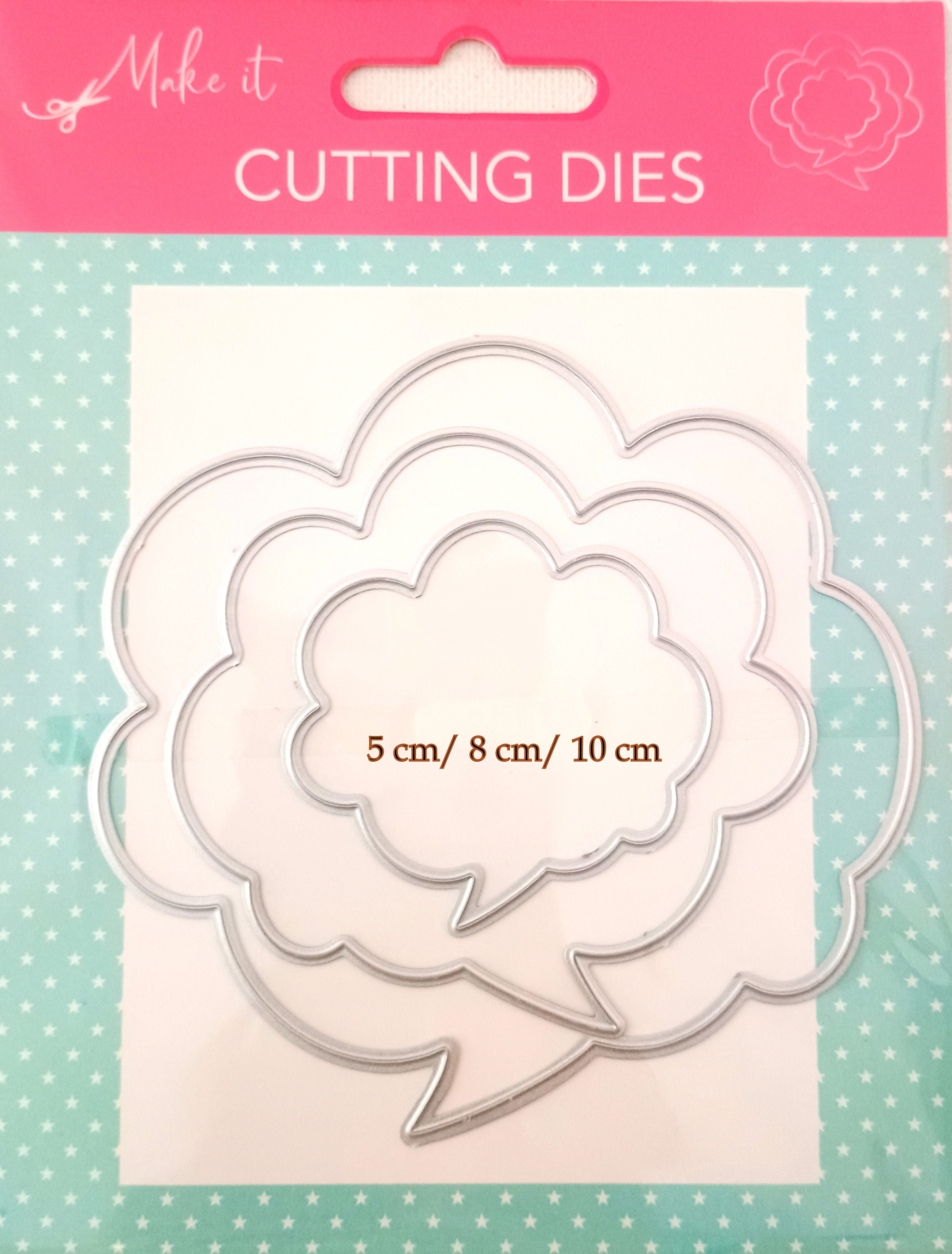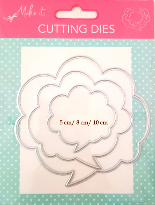 Acest set conține cuttere pentru decupare în formă de bulă de dialog, cu margini ondulate și un mic „vârf” care indică direcția vorbirii. Setul include mai multe dimensiuni (aprox. 5 cm, 8 cm și 10 cm), perfecte pentru a crea straturi (layering) și efecte vizuale interesante.